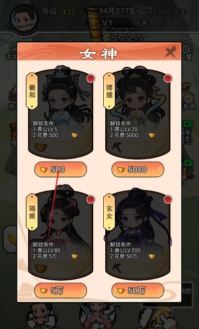 4、元宝收益还能用于解锁和升级女神,升级后的女神可对愚公挖山时的元宝收益与攻击力进行加成。