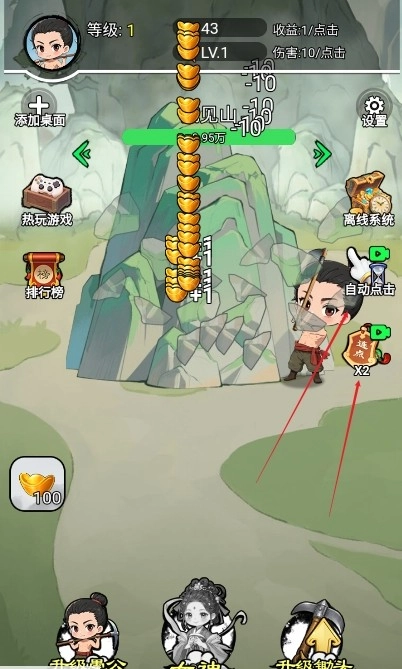 1、点击屏幕让愚公进行挖山操作,挖山可获得元宝收益;