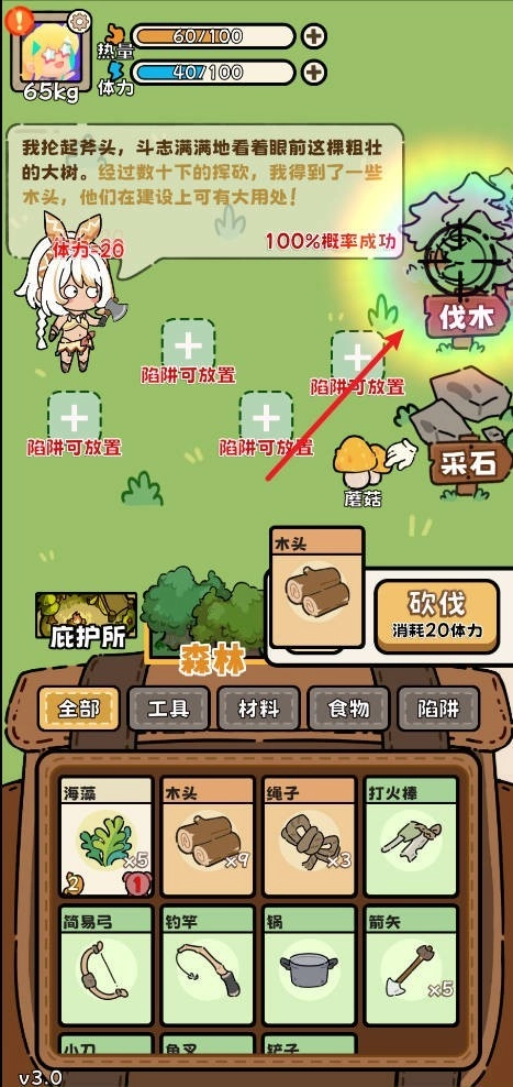 4、前期开局状况不佳,又没拿到树脂(能让添加柴火的时间翻倍)这个道具,那就得砍70到75棵树去碰运气找大冰块(要是选了冰箱,而且前十五天能打到不少熊或者海豹,这条就不用管了)
