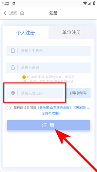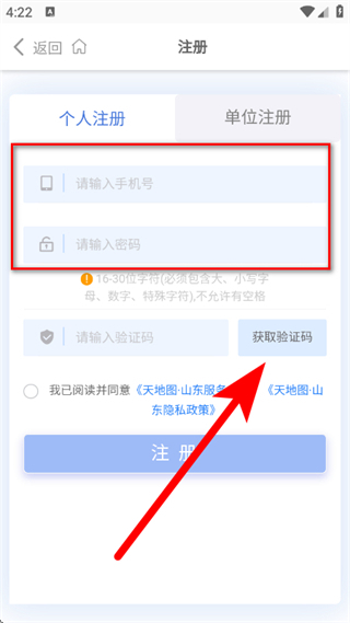 4、在注册页面,输入手机号、密码后,点击获取验证码。