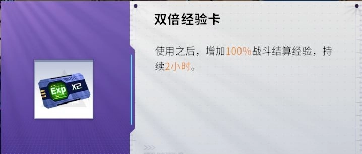 【双倍经验卡】使用后增加100%战斗结算经验,持续2小时。