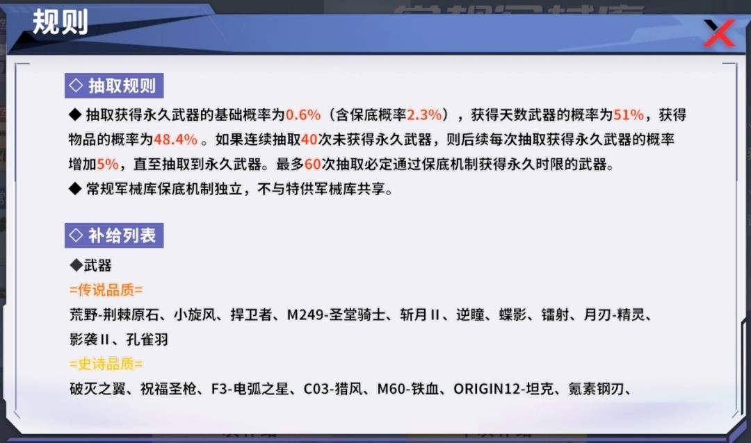 军械库包含特供与常规两类,二者补给时消耗的材料道具存在差异。进行补给操作均有机会获取永久武器。