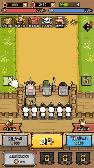 1、打开游戏后选择添加弓箭手和武将点击战斗。