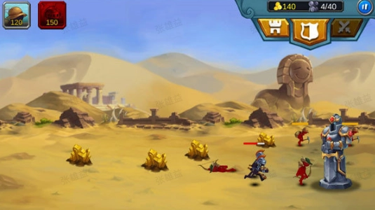 开局建议优先造一把矛,接着生产8个矿工——由于单个矿点最多允许两个矿工同时开采,数量过多的话,多余的矿工可能会跑到敌方矿区去挖矿。之后等敌人出现,就操控矛兵,同时让矿工撤退,依靠城堡里的弓兵进行射击,你只需举着盾牌吸引敌人的火力,确保他们不会攻击雕像即可。