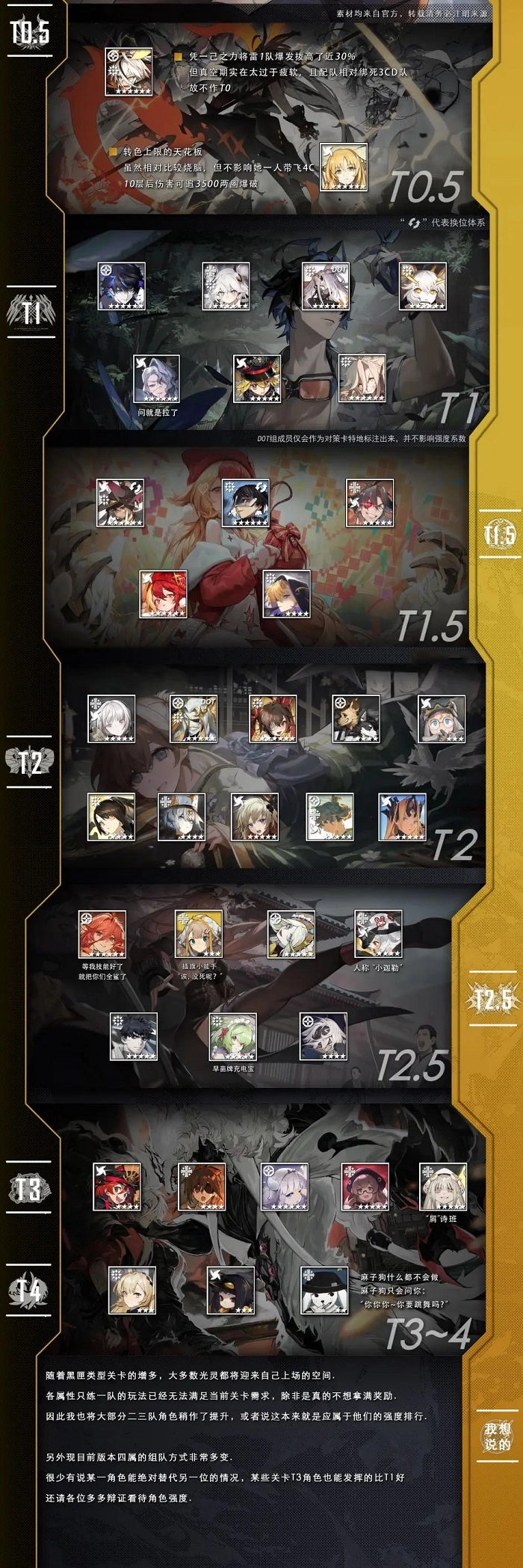 这份榜单是全角色满破状态下的强度排行榜,强度评定参考了常规主线、高难关卡、竞速玩法以及灾典模式,同时会提高角色在其各自擅长领域的评价权重,比如卢克在对单场景中属于T1级别。