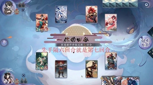 先手开局对方战斗区没有式神,我方可以获得一次直接打对方的牌手的机会。先手开局会率先将一个式神升到3级,获得一次改变局势的机会。