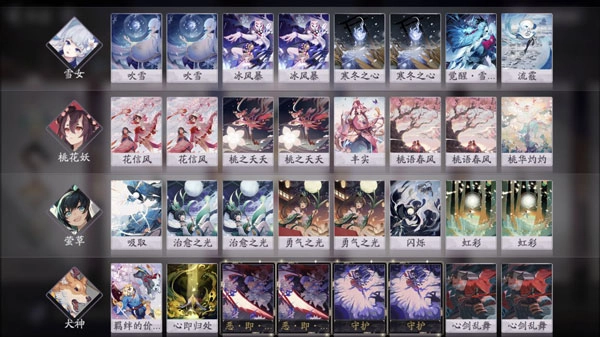 第三套卡组由雪女、桃花妖、萤草和犬神组成,属于娱乐向的雪女流霰体系。这套卡组的核心思路是借助其他式神的摸牌与保牌手段,为雪女积累大量雪球以达成对敌方牌手的斩杀。其中萤草和桃花妖作为辅助组件,既能复活犬神、恢复其状态,让犬神持续承担伤害,又具备一定的摸牌能力;雪女则需要尽早打出冰风暴和觉醒形态,从而获取更多雪球。