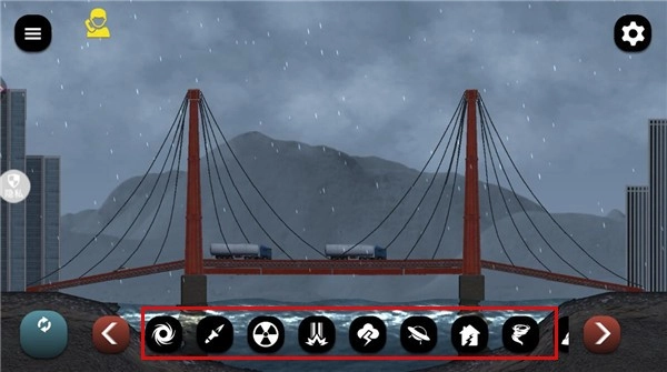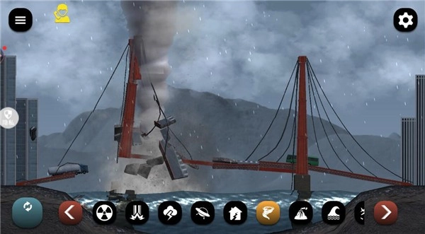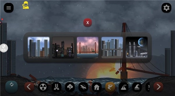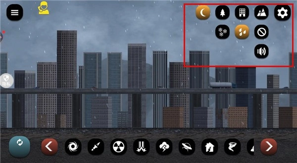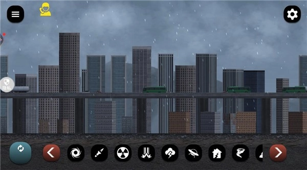 1、启动游戏后,能看到底部工具栏里有各式各样的灾害类型,比如龙卷风、核弹、飞碟、地震之类的,你可以随意挑选一种灾害去对城市进行破坏,玩起来特别畅快