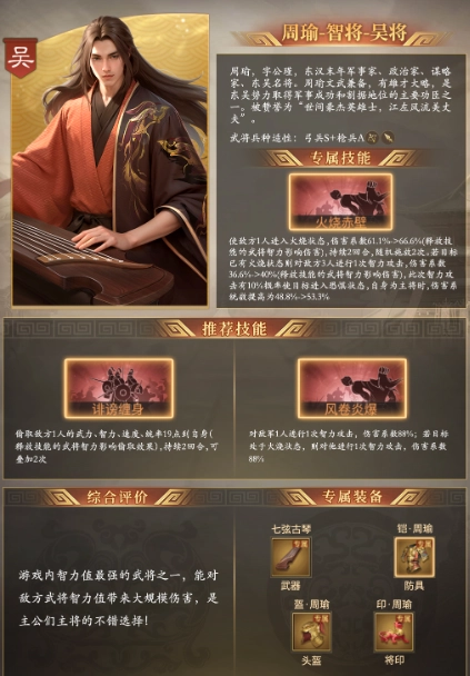 周瑜是游戏里智力顶尖的武将之一,能对敌方武将造成大范围的智力伤害,是主公们挑选主将时的优质选择!