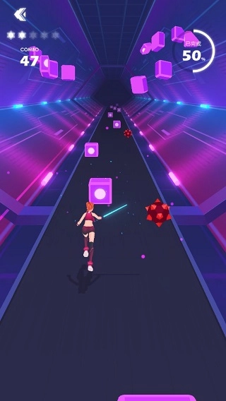 2、跟着富有动感的音乐节奏,长按屏幕并左右滑动,操控游戏里的小人,用小人手中的光剑去切开迎面飞速而来的方块!与此同时,可一定要留意避开所有的障碍哟~