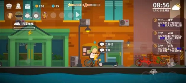3、共享单车每次2元(上下车计为一次,建议提前规划好行程。骑行过程中可进行对话、购物等操作,但仅限街道上的镇民使用),骑行时加速会消耗精力值,同时可获得活力经验(显示为红色)。