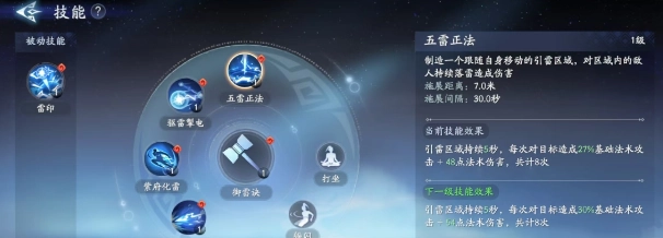 第1个主动技能五雷正法,创造出一个引雷区域,该区域会跟随玩家一起移动,所有区域内的敌人都会持续受到落雷伤害。在一级的时候,引雷区域将持续5秒钟,一共造成8次伤害。