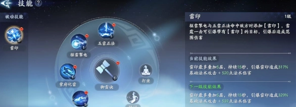 最后一个技能是雷霆一击,对直线路径上的敌人造成伤害,该技能伤害比率比较高,是很好用的输出技能。还拥有一个被动雷印,雷震子的驱雷掣电技能和五雷正法技能,在命中敌人时都会添加雷印,使用雷霆一击可以将雷印引爆造成范围伤害,雷印最多能叠加到5层。