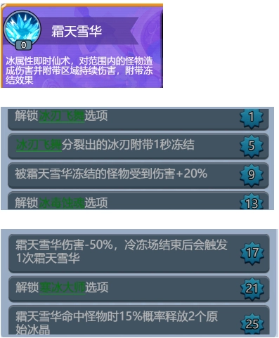 17级:霜天雪华伤害-50%,冷冻场结束后会触发1次霜天雪华。