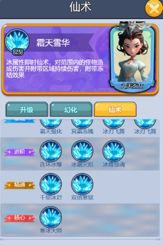 霜天雪华:冰属性即时仙术,对范围内的怪物造成伤害并附带区域持续伤害,附带冻结效果。