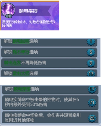 驭雷缚(入门):麟电疾缚累计命中30名怪物,对战场4个目标释放驭雷缚,弹射2次。