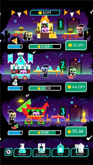 2、不断的进行点击,赚更多的钱来成为顶级大亨,升级食物摊位,学会更好的管理公司。