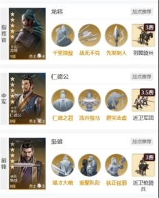 4、三国队:龙将、仁德公、枭雄。龙将需要叠层,仁德公和枭雄给予高额叠层,再加上先发制人,稳定一直触发伤害,加爆发高额战无不克。仁德公提供治疗和增伤。同时携带减伤+持续治疗进一步给龙将叠恢复。枭雄前锋扛伤害,同时携带免BUFF技。