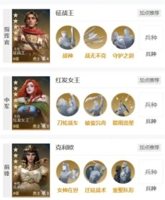4、三狮女王:辅助武将,骑兵,普攻距离3。技能为【王冠】,开场技能,距离2,100%发动,属于一个前期进攻压制技能,提高英雄的追击伤害和连击能力。技能简单粗暴,对于有追击技能和高输出的英雄非常搭配。推荐搭配:雄狮王+三狮女王+铁公爵、库比+三狮女王+铁公爵、吉加美士+三狮女王+铁公爵。