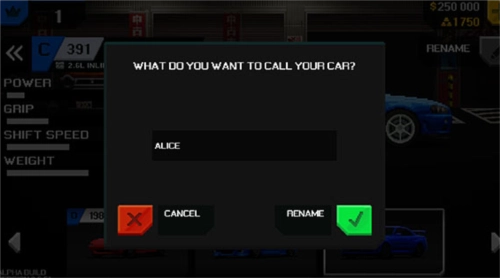2、玩家可以选择车库中比较喜爱的那几辆为它们取昵称,昵称会在比赛结束时显示