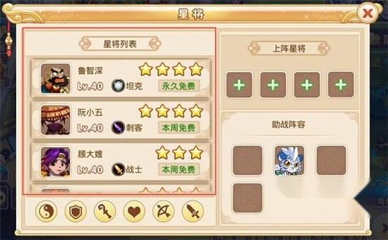 这里展示所有星将,涵盖不同等级、不同职业,以及解锁状态和是否免费(非免费星将无法上阵)。