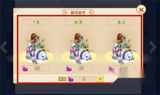 可以解锁不同时限的星将。星将解锁需要星将碎片材料,主要通过商城购买。