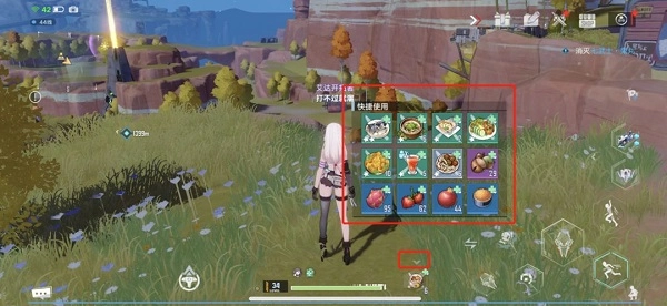 11、切换食物:点击食物上方的小箭头,可以展开食物栏,就可以看到现有的所有食物,点击后可以直接装备。