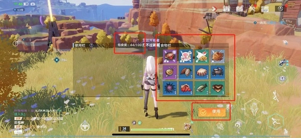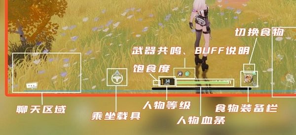 8、饱食度:点击小圆可打开饱食度食物栏,同时能查看自身当前饱食度数值。饱食度的作用类似于回血储备,脱战时会自动为角色回血,但会消耗饱食度。需要注意的是,一般情况下所有食物都能增加饱食度,不过提升耐力的食物除外。