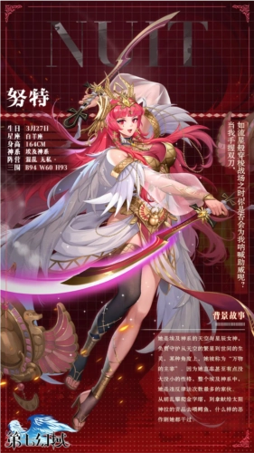 埃及神系里司掌天空与星辰的女神,肩负着守护天空繁星直至世间生灵的职责,从某种角度而言,她有着“万物主宰”的称号。同时,她还是埃及著名的九柱神成员之一,并且承担了部分掌管死亡的神职,埃及不少石棺上都绘制着她的形象,以此来祈求获得她的庇护。
