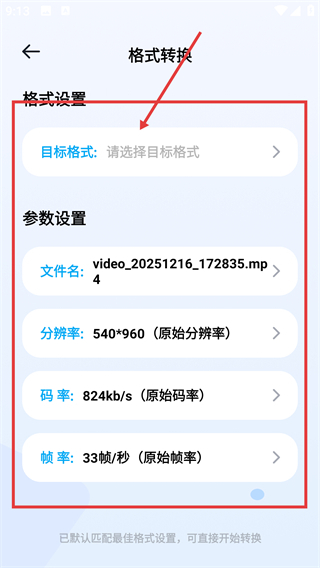 2、在格式转换页能设置【目标格式】和参数,像文件名-分辨率这些都可以按需调整哦。
