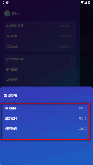 2. 接着,在弹出的一系列选项中选择“歌词设置”这一项。