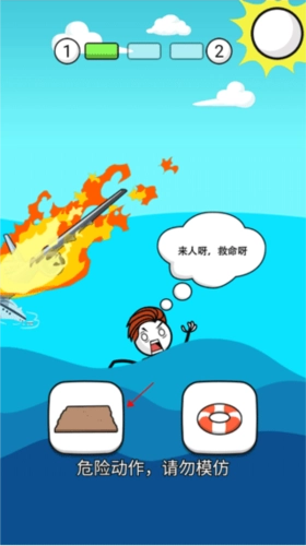 3、选择正确的道具之后就会开启下一个剧情,选择板子让火柴人在板子上漂。