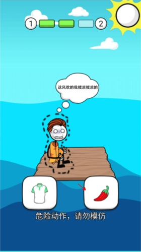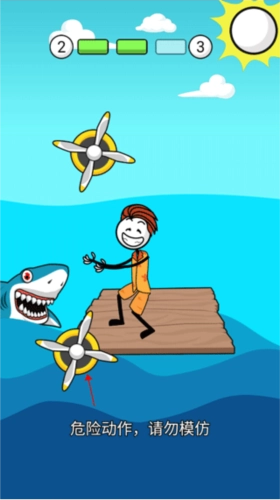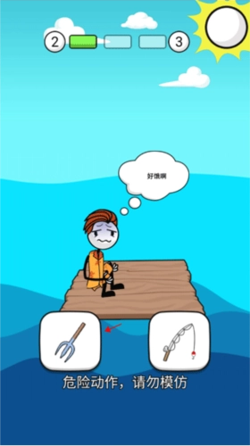 7、火柴人喝够水后,肚子又开始饿了,得找点东西吃。用叉子能把鱼叉上来,要是选钓鱼竿的话,很可能会钓上鲨鱼,那可太危险了。
