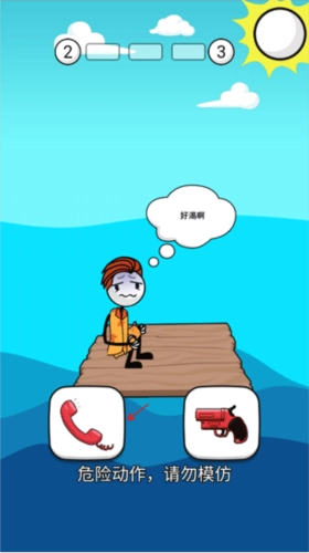 6、第二关承接上一关的剧情,此时火柴人十分口渴,急需饮水。若选择使用枪支,物资会被风吹走;而选择电话,则能让外卖小哥送水过来。