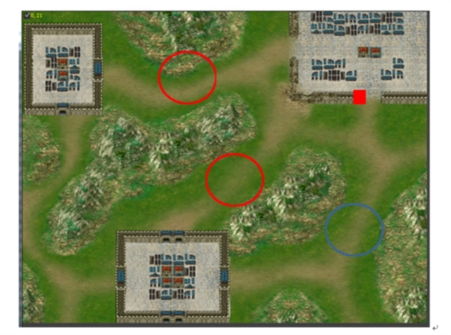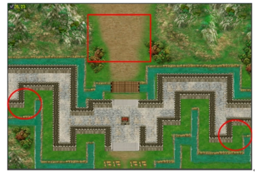 地图上蓝圈标记的区域会出现无限复活的破甲副将,处理方式是让站在红色方块处的防守角色不要击杀他们,这样他们就会一直停留在城门口。而红圈标记的区域各自藏有一波伏兵,需要留意。