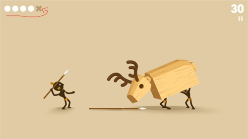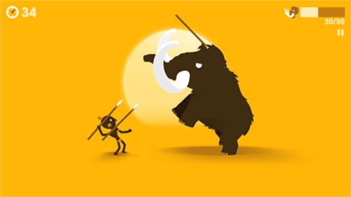 1、游戏开始时,玩家仅持有10杆标枪,游戏目标十分明确:需在限定时间内成功射杀猛犸象。当猛犸象朝你发起攻击时,点击左侧屏幕即可后退并投掷标枪。
