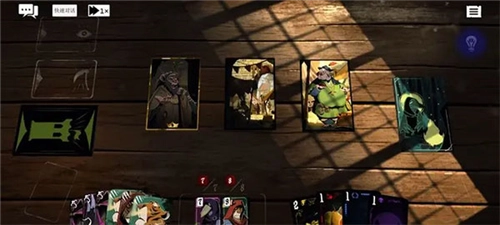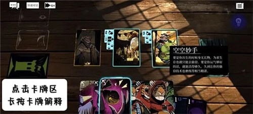 首先为大家介绍预言奇谈游戏里冒险者们日常接触最多的场地界面:画面最底部从左至右依次排列着角色的技能卡、中间的角色状态卡,以及右侧的资源卡;画面正中央会随机生成3到6张场景卡,玩家可借助手中的技能卡与资源卡,和场景卡进行互动以达成各类效果。若长按场景卡,手中能与之交互的卡牌会高亮显示;反之,长按卡牌的话,则会高亮可交互的场景卡,同时告知具体的交互效果。