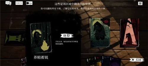 场景右侧设有休整牌库,点击后会呈现各类休息牌。玩家选择休息即可为每个角色恢复三张技能卡,不过部分特殊休息牌会要求消耗额外资源或带来不利影响,这就需要冒险者们仔细权衡、谨慎决策后再行动!