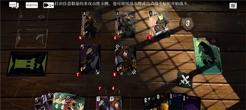 玩家和敌人互动时,同样可以用手中的卡牌触发各类效果,部分攻击型技能卡能直接对敌人造成伤害并将其击败!(卡牌左下角标注着血量与攻击力数值,双击右下角的武器图标即可立即进入战斗状态)