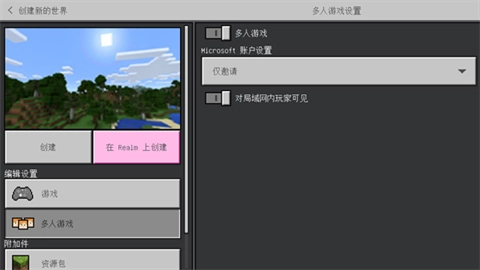 2、依次点击游戏、新建、创建新世界;创建世界的各项设置可根据个人喜好自行调整,但多人游戏相关设置务必开启,同时要打开“对局域网内玩家可见”这一选项;Minecraft账户设置建议调整为仅邀请模式,以防其他玩家随意进入。