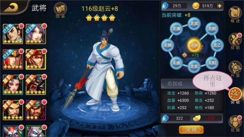 进入游戏后点击武将按钮即可进入武将系统,武将突破功能就在其中。接着点击突破按钮,便能进入武将突破系统。突破所需的基础材料有金币、突破石和元宝,并且随着突破等级的提高,每次突破所需的材料数量也会相应增加。每完成9次突破,武将的颜色就会发生一次变化,颜色等级从低到高依次为白色、绿色、蓝色、紫色、橙色、金黄色1、青绿色、青紫色、金黄色2、红色、深金色、橙红色。需要注意的是,当突破到+8阶段时需要消耗元宝。突破能够带来攻击、防御、血量、暴击、抗暴以及绝伤等属性的增益效果,每次突破所获得的具体效果,在突破界面中会有直接的展示。