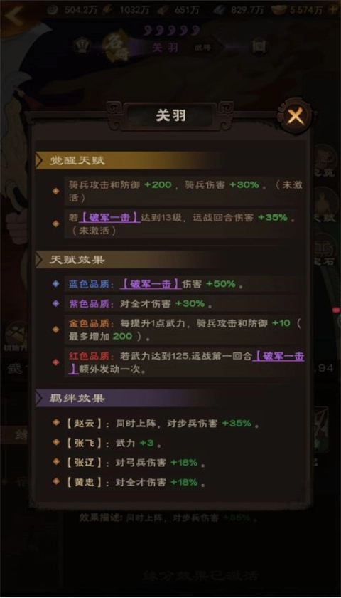 2、首先我以热门武将关羽为例进行讲解。先看关羽的天赋效果:蓝色天赋是让破军一击的伤害提升50%,红色天赋能让破军额外发动一次——从这里很容易看出,关羽极度依赖自带的“破军一击”技能。而觉醒天赋的效果是增加破军一击在远战回合的伤害,这意味着关羽属于典型的“技能型武将”,需要依靠频繁释放技能来打输出。此外,他的金色天赋和觉醒天赋还都有骑兵前排伤害加成,进一步为他创造了暴力输出的条件。 由此不难总结:技能型武将的天赋或觉醒效果中,通常会带有“指定技能增伤”或“远战回合增伤”这类词条。我简单举几个例子,像黄月英、貂蝉、姜维、孙尚香、甘宁等英雄,都属于这类需要通过短时间内释放大量技能来打出爆炸伤害的类型。