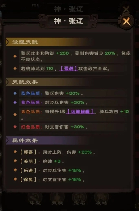 3、接下来聊聊兵种武将。这类武将的核心机制是通过天赋与技能的多重BUFF叠加,依托兵种的普攻和小技能来输出伤害。拿张辽举个典型例子:他的蓝色天赋对骑兵有伤害加成,紫色天赋针对步兵增伤,金色天赋能提升“运筹帷幄”等级来强化骑兵攻击——而“运筹帷幄”本身是给兵种加伤减伤的;红色天赋则对文官有加成。可以看出,张辽自身并没有直接强化输出技能的机制,主要靠叠加BUFF获取兵种伤害增益,由小兵承担输出主力,通常会等技能型武将的爆发期过去后,再持续输出。这类兵种武将还有不少典型代表,比如赵云、张飞、夏侯渊、马超、大乔等,他们需要先提升自身减伤能力,拖到近战回合再打出伤害。