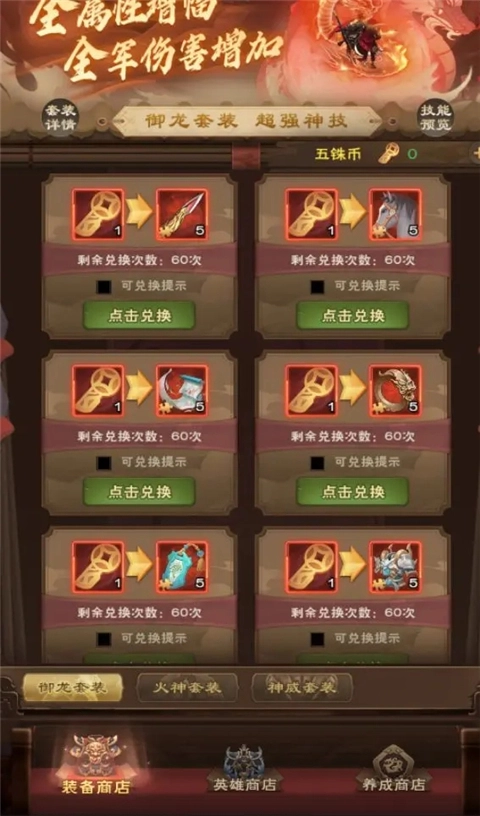 6、兑换币、获得方式为每充值60元会获得一个主要是购买套装,武将碎片,以及练兵材料。