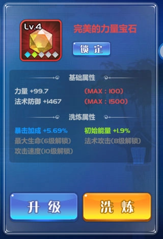 ②、洗练属性则是在获得宝石时,系统随机生成的五条属性类型(不会出现重复属性),而每条属性可通过升级宝石实现激活,后续可通过洗练(消耗宝石晶粉)改变属性数值,品质越高洗练属性的上限值越大。