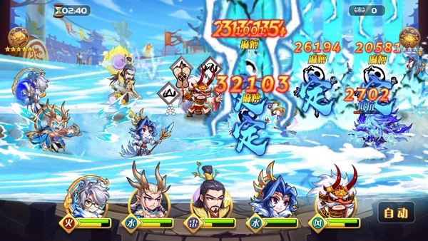 手动释放技能的已过时,战斗中需要实时观察战况,对武将进行微操作。技能分为“水、火、定、毒、雷、斩、盾、风、破、治”十大特效,各属性技能相互产生组合效果。