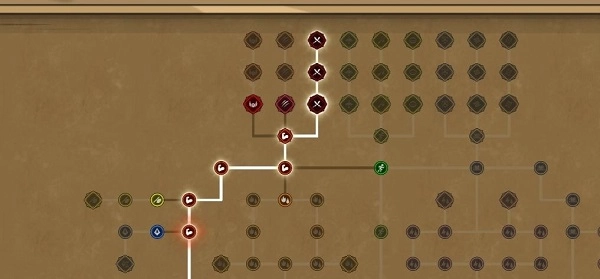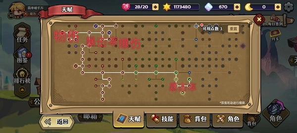 从实用角度来看,右下加20智力和力量的天赋位置比较靠后,而且我主要是堆攻击属性,所以这个天赋可以不用点。大家可以根据自己的实际需求,选择点普攻强化或者翻滚回血的天赋;要是格挡属性不够的话,点格挡相关的天赋也可以。