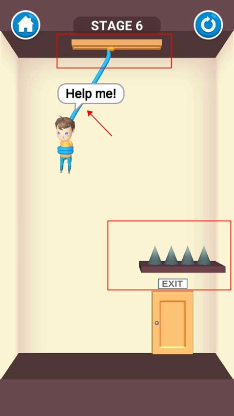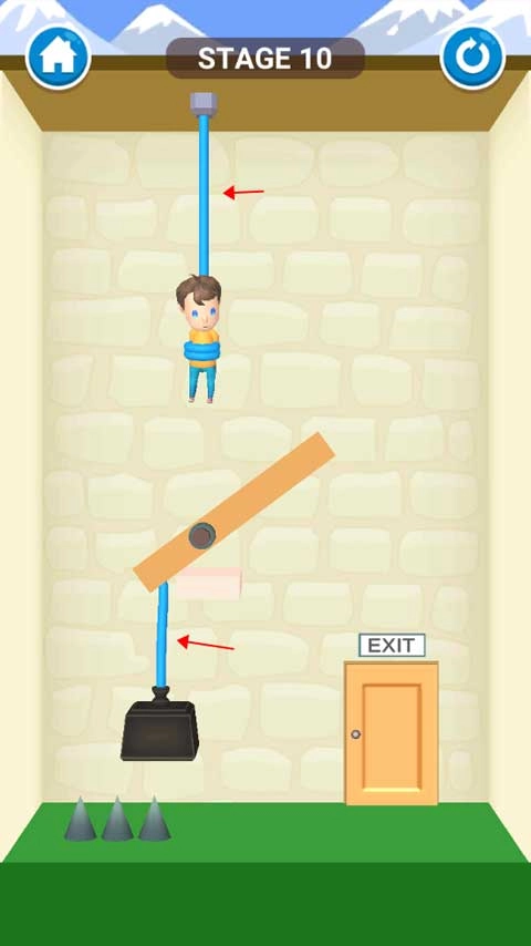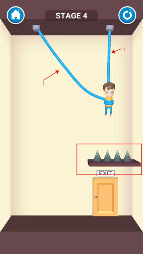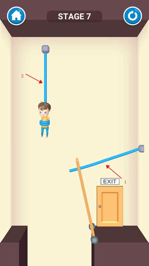 这一关很简单,只需用手指划过悬挂小男孩的绳子,小男孩获救后会自行走向出口,这样就能通过关卡了。