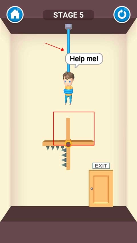 这个关卡融合了尖刺与转盘元素,玩家得等转盘转到安全区域时,才能剪断绳子解救小男孩。