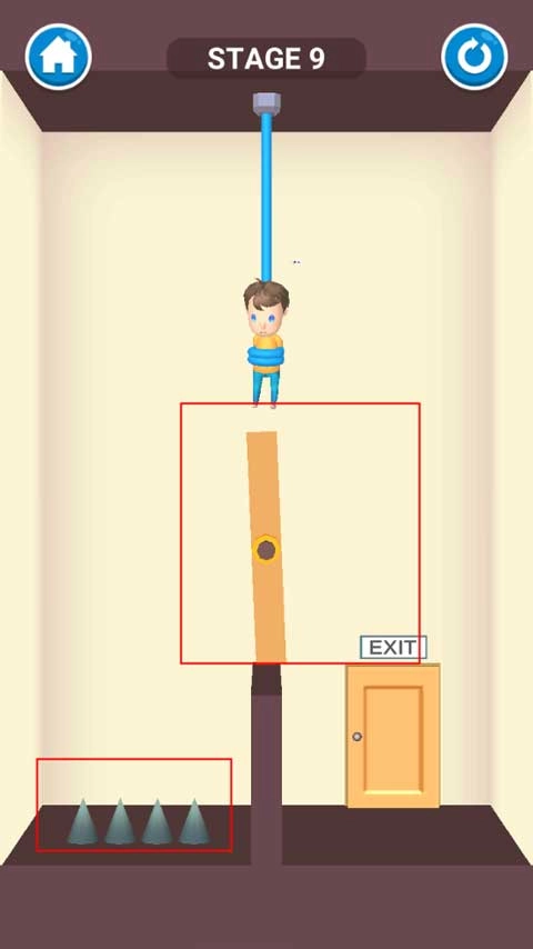 这次的设计是把尖刺和滚轮结合起来,滚轮会左右滑动,玩家需要等小男孩移动到左边的位置时,剪断绳子就能救他了。